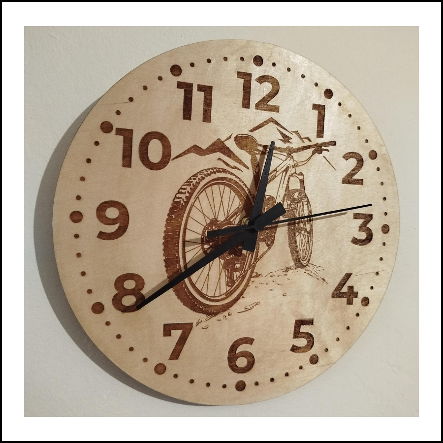 Wyjątkowy, ręcznie wykończony zegar ścienny wykonany ze sklejki drewnianej z grawerem rowerowym.