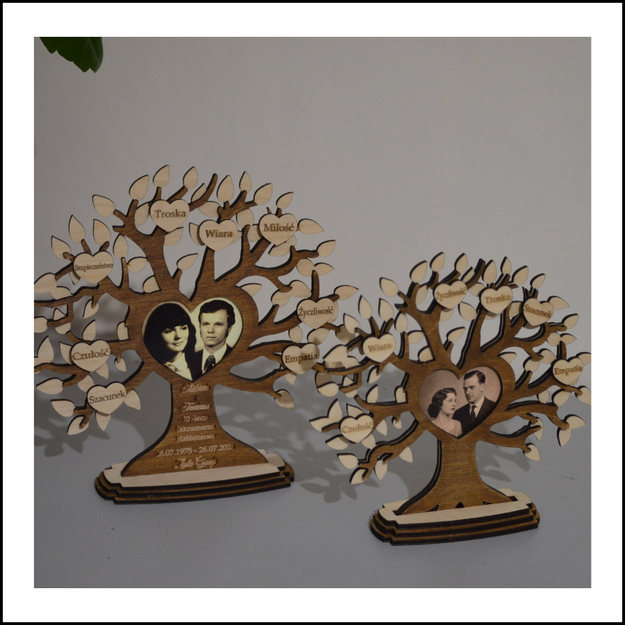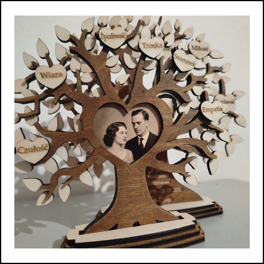 Nasze drzewo rodzinne to wyjątkowa pamiątka – połączenie misternie wygrawerowanych wartości takich jak miłość, troska, szacunek czy empatia, z osobistym akcentem w postaci wklejonego zdjęcia. To hołd dla Waszej historii, wspólnych chwil i niezłomnego trwania razem.